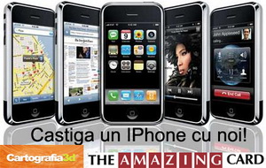 A inceput nebunia IPHONE si in Romania si stim ca si tu iti doresti unul. Ce bine ar fi sa nu trebuiasca sa il platesti! Si se poate! Tot ce trebuie sa faci este sa intri pe unul din saiturile noastre: www.amazingcard.ro sau www.cartografia3D.ro si sa comanzi produse in valoare de minim 50RON. Vei primi in schimb felicitari sau harti 3D absolut impresionante si vei intra automat in cursa pentru un IPHONE. Asta pentru ca stim ca esti important si ca meriti mai mult.