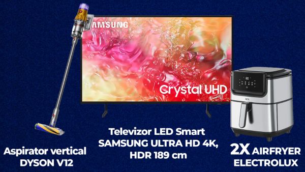 Câștigă un televizor LED Smart Samsung 75DU7172 Ultra HD 4K HDR 189cm, un aspirator vertical Dyson V12 Detect Slim Absolute sau una dintre cele 2 friteuze cu aer cald Electrolux Digital Air Fryer E6AF1-4ST!
