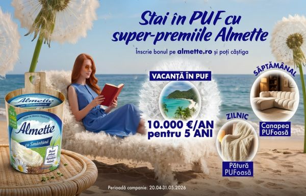 Cumpără orice produs Almette Cremă de brânză din magazinele Auchan, Carrefour, Kaufland, La Doi Pași, Lidl, Mega Image, Penny, Profi, Selgros, Metro sau din aplicațiile Freshful, Sezamo, Glovo, Wolt, Bolt Food și înscrie bonul fiscal împreună cu datele personale în formularul de concurs de pe pagina campaniei promoționale Almette – Stai în puf cu super premiile Almette.