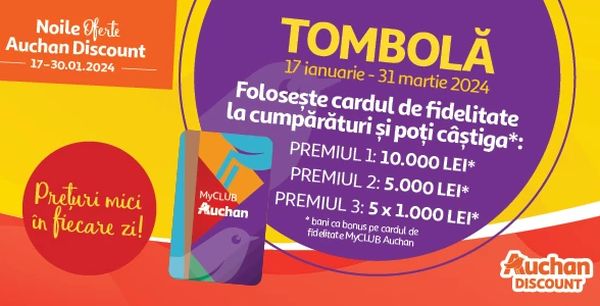 Fă-ți cumpărăturile în magazinele Auchan Discount Ploiești sau Auchan Discount Timișoara Calea Șagului, folosește cardul de fidelitate MyCLUB Auchan și poți câștiga prin tragere la sorți, pentru fiecare din cele 2 magazine Auchan Discount, unul dintre cele 5 vouchere de cumpărături Auchan în valoare de 1.000 de lei fiecare, un voucher de cumpărături Auchan în valoare de 5.000 de lei sau un voucher de cumpărături Auchan în valoare de 10.000 de lei.