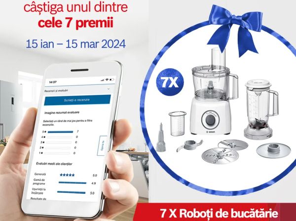 De aceea te provocăm să ne lași un review pentru aparatul electrocasnic Bosch care îl utilizezi, iar astfel poți câștiga, prin tragere la sorți, unul dintre cei 7 roboți de bucătărie Bosch MultiTalent 3 MCM3200W.