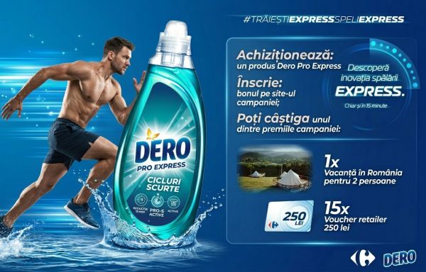 Cumpără oricare produs Dero Pro Express din magazinele Carrefour Hypermarket și înscrie bonul fiscal împreună cu datele personale în formularul de concurs de pe pagina campaniei promoționale Descoperă inovația spălării express, chiar și în 15 minute.