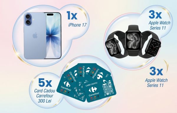 Poți câștiga prin tragere la sorți unul dintre cele 5 vouchere de cumpărături Carrefour în valoare de 300 de lei fiecare, unul dintre cele 3 ceasuri Apple Watch Series 11 sau un telefon mobil Apple iPhone 17 256GB 5G.