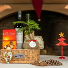 Cos rachita traditional impletit manual – Vin rosu sec Sarica Niculitel Merlot, soi Cabernet Sauvignon – 0.75 L; Cozonac traditional cu rahat, stafide si nuca – 500 g; Praline de ciocolata – 120 g; Brad natural in ghiveci cu eticheta personalizata; Decoratiune de Craciun realizata manual de copiii de la Casa de copii „Mia’s Children”; Ambalaj festiv de Craciun.