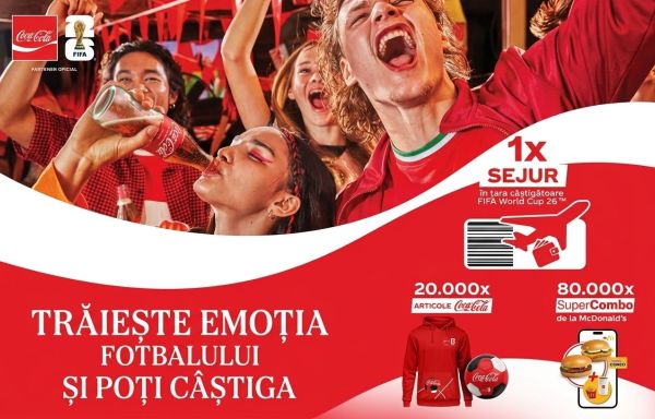Câștigă o vacanță de vis pentru 2 persoane în țara câștigătoare a FIFA World Cup 2026 în valoare de 50.000 de lei, unul dintre cele 8.000 de hanorace personalizate Coca-Cola, una dintre cele 12.000 mingi de fotbal personalizate Coca-Cola sau unul dintre cele 80.000 meniuri SuperCombo McDonald’s!