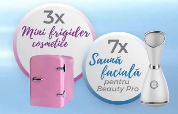 Poți câștiga prin tragere la sorți una dintre cele 7 saune faciale Beauty Pro sau unul dintre cele 3 mini frigidere cosmetice Blossom Pink Meloni Care.