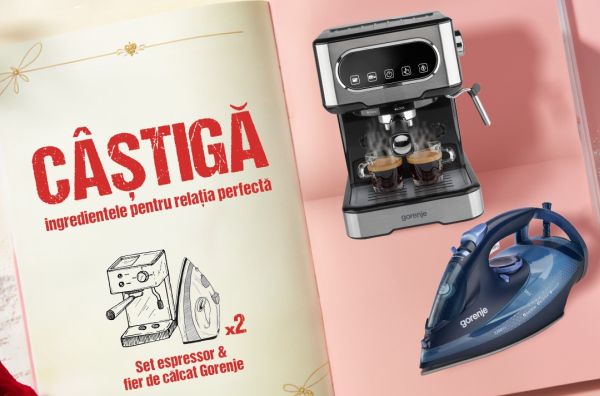 Câștigă unul dintre cele 2 seturi de electrocasnice mici Gorenje, fiecare set fiind format dintr-un espressor manual Gorenje ESCM15DBK și un fier de călcat Gorenje SIH3200DB!