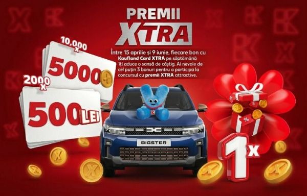 Poți câștiga prin tragere la sorți unul dintre cele 10.000 de premii constând în câte 5.000 de puncte Kaufland XTRA, unul dintre cele 2.000 vouchere de cumpărături Kaufland în valoare de 500 de lei fiecare sau o mașină Dacia Bigster Extreme Hybrid 155CP.