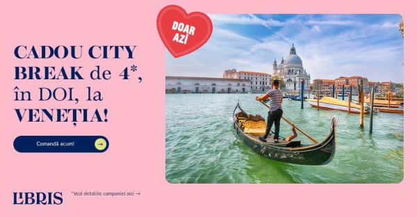 Plasează o comandă pe LIBRIS și indiferent de conținutul acesteia vei intra automat în tragerea la sorți a unui city break de 4* pentru 2 persoane cu destinația Veneția, cu 3 nopți cazare și mic dejun inclus în perioada 20 – 23 martie 2024.