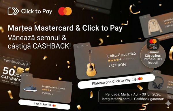 Câștigă garantat până la 50 de lei cashback (bani înapoi) pe cardul tău Mastercard pentru prima ta plată online efectuată într-o zi de marți, prin Click to Pay cu cardul Mastercard înscris, la comercianții participanți din România!