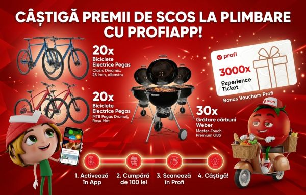 Câștigă una dintre cele 20 biciclete electrice Pegas Drumeț Dinamic, una dintre cele 20 biciclete electrice Pegas Clasic Dinamic, unul dintre cele 30 grătare pe cărbune Master-Touch Premium GBS E-5775 Weber sau unul dintre cele 3.000 de vouchere de cumpărături Profi în valoare de 100 de lei fiecare!
