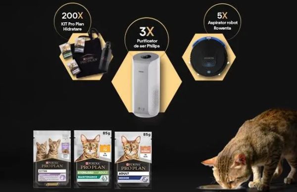 Câștigă unul dintre cele 3 purificatoare de aer Philips, unul dintre cele 5 aspiratoare robot Rowenta X-Plorer Serie 45 RR8275WH sau unul dintre cele 200 kit-uri Purina Pro Plan (14 plicuri de hrană umedă Purina Pro Plan Nutri Savour, un tote bag și o sticlă de apă personalizate Pro Plan)!
