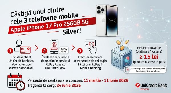 Dacă ești deja client UniCredit Bank sau devii client UniCredit Bank pe durata campaniei promoționale, înrolează-ți numărul de telefon pe care-l folosești în relația cu banca în serviciul RoPay Alias cu UniCredit Bank și efectuează minim o tranzacție de cel puțin 15 lei prin RoPay din cadrul aplicației Mobile Banking – UniCredit Bank.