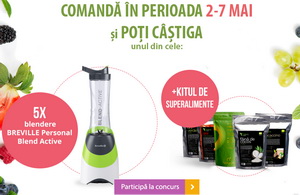 Orice comandă, indiferent de valoarea sa, plasată în perioada 2 – 7 mai 2017 pe Vegis și livrată cu succes, intră automat în tragerea la sorți pentru a câștiga unul dintre cele 5 blendere Breville Personal Blend Active împreună cu kit-ul de superalimente pentru smoothie-uri care conține: Mix Organic Verde Naturya, Făină de Cocos Bio Niavis, Fructe Goji Niavis, Pulbere MaccacinoNiavis, Pulbere Orz Verde Niavis.