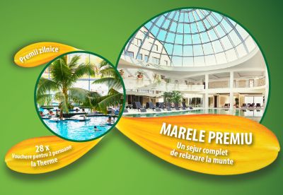 Poți câștiga premii de relaxare: 28 vouchere la Therme pentru 2 persoane în valoare de 100 lei fiecare sau un sejur complet de relaxare la munte pentru 2 persoane.